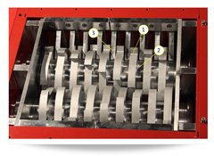 ① 動刀:剪切物料  ② 隔套:控制動刀間隙  ③ 定刀:防止物料纏繞刀軸